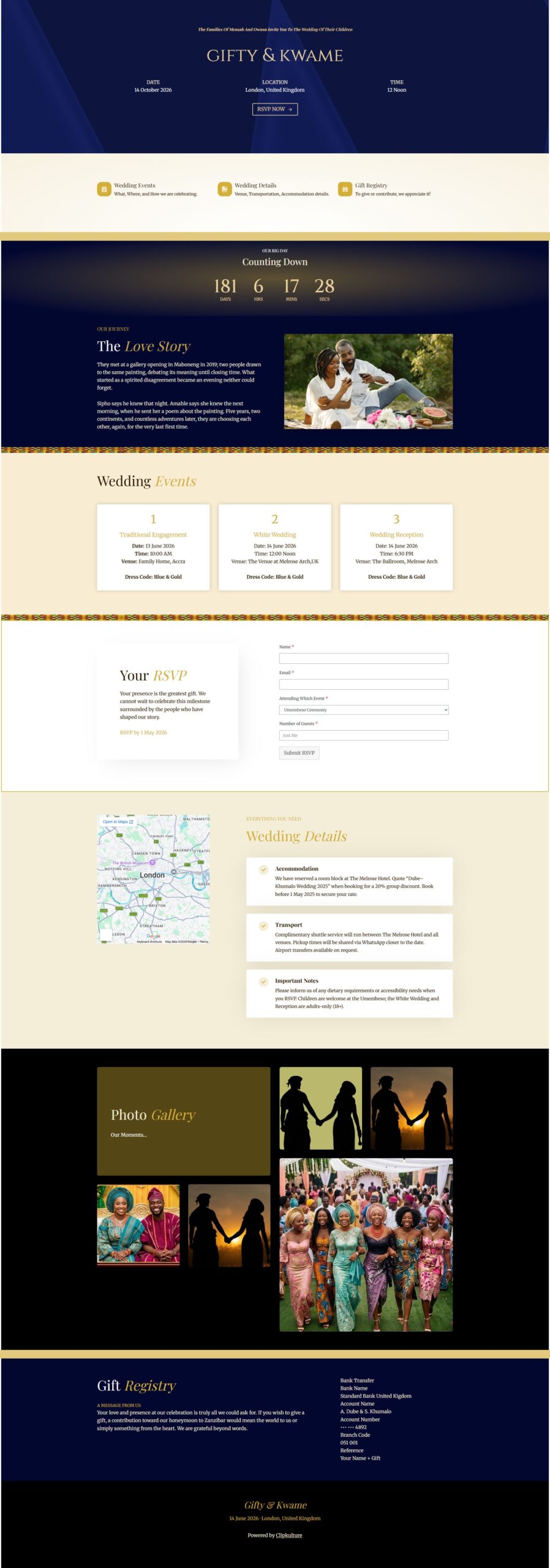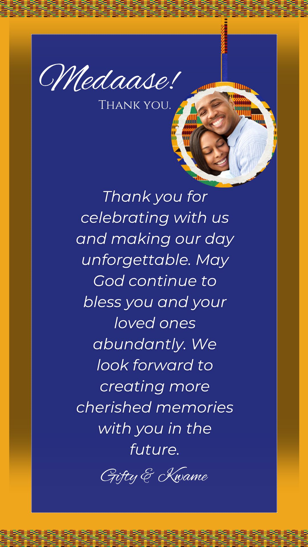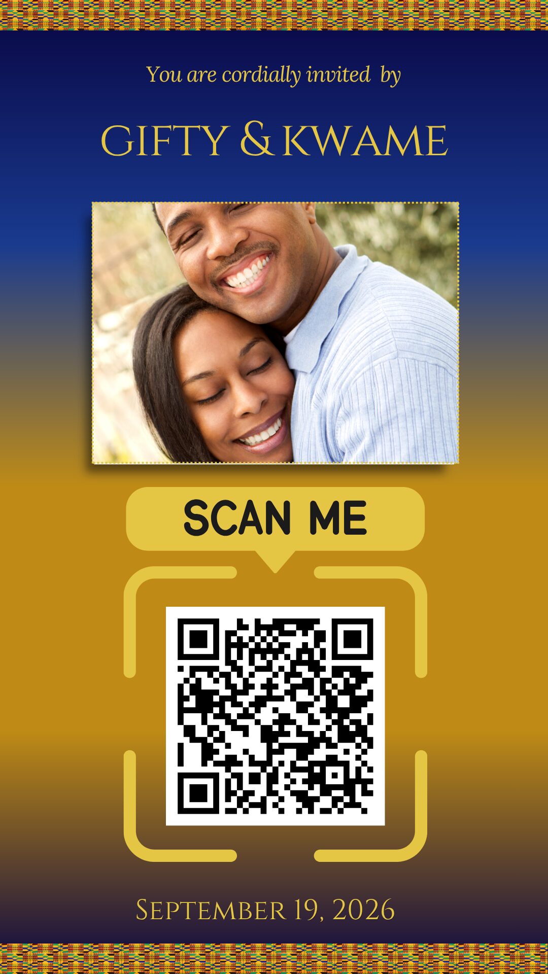 A beautifully designed Kente-inspired Digital Wedding Hub that brings your invitations, RSVP, programme, and wedding details into one seamless online experience.