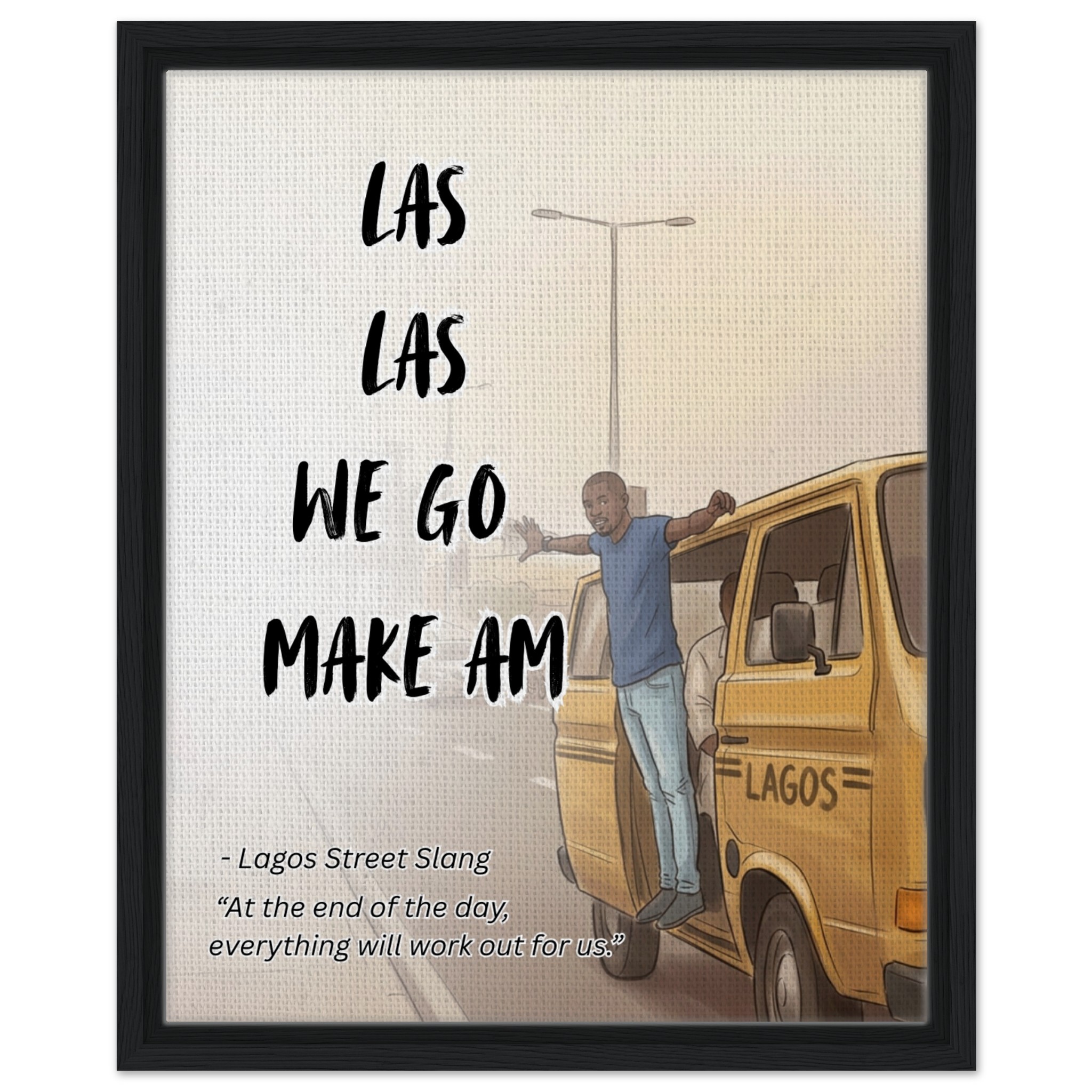 This framed canvas captures a bold, everyday moment from Lagos: a bus conductor standing atop a yellow danfo, full of energy, movement, and street resilience. Paired with the iconic phrase “Las las we go make am,” this piece carries a message deeply rooted in Nigerian street culture; a confident reminder that no matter how tough things get, it will eventually work out.